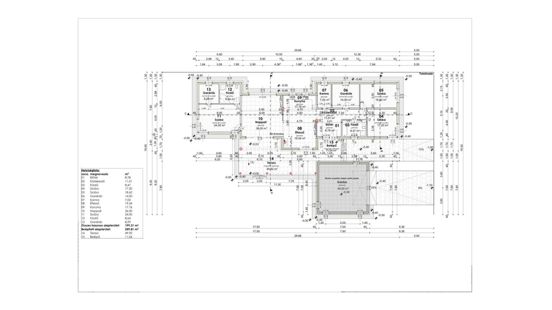 A ház bruttó 249,81 m² beépített területtel és nettó 199,31 m² hasznos alapterülettel rendelkezik, nappali + 3 szobás kialakítással, amely kényelmes és jól elkülöníthető élettereket biztosít.